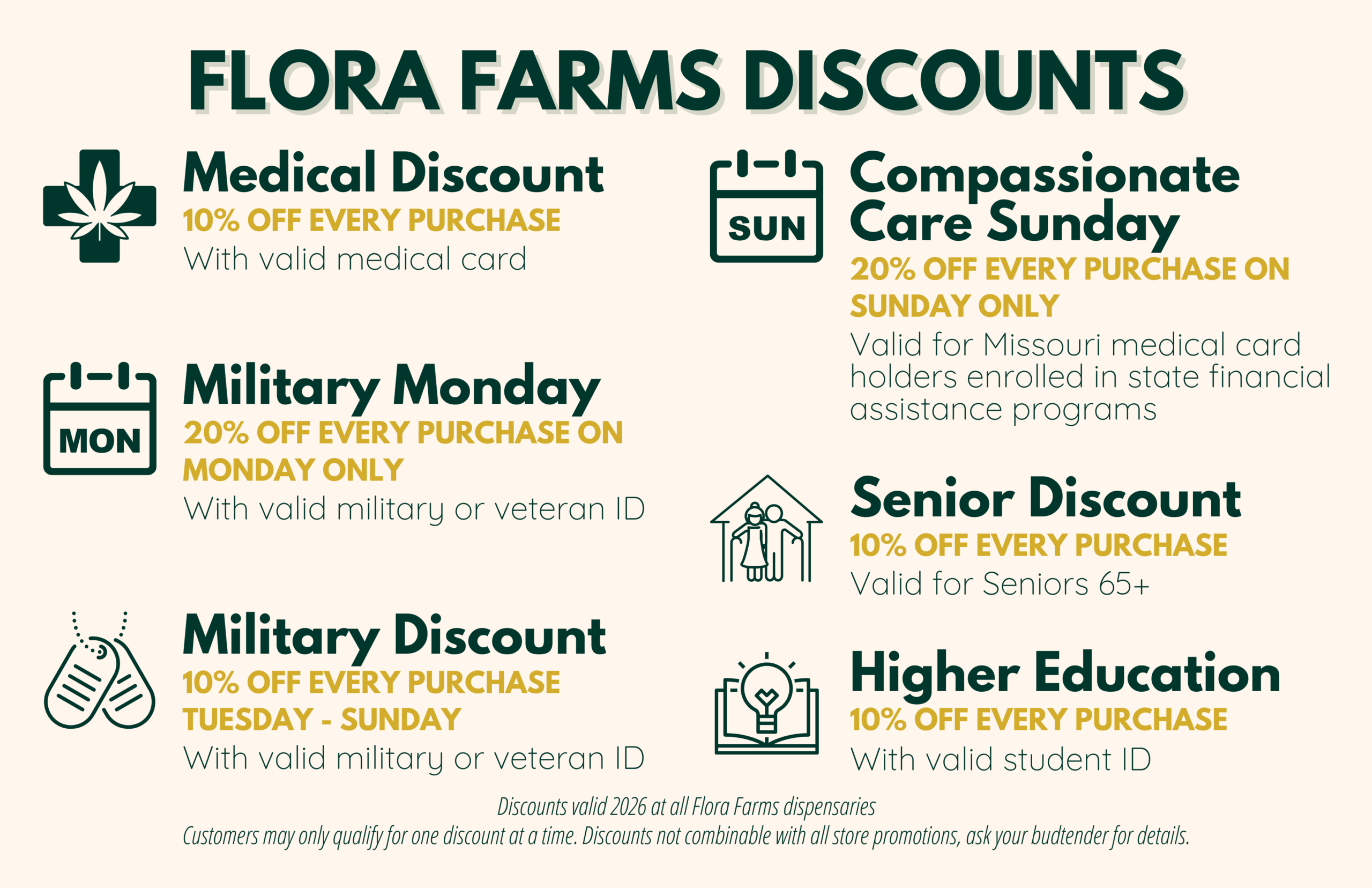 - Stay connected: To keep up with special offers, events, and new product drops, visit florafarmsmo.com/loyalty sign up, and download the Flora Farms app.
